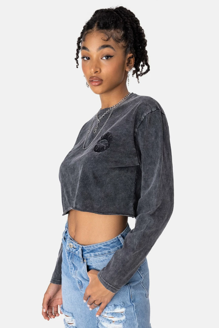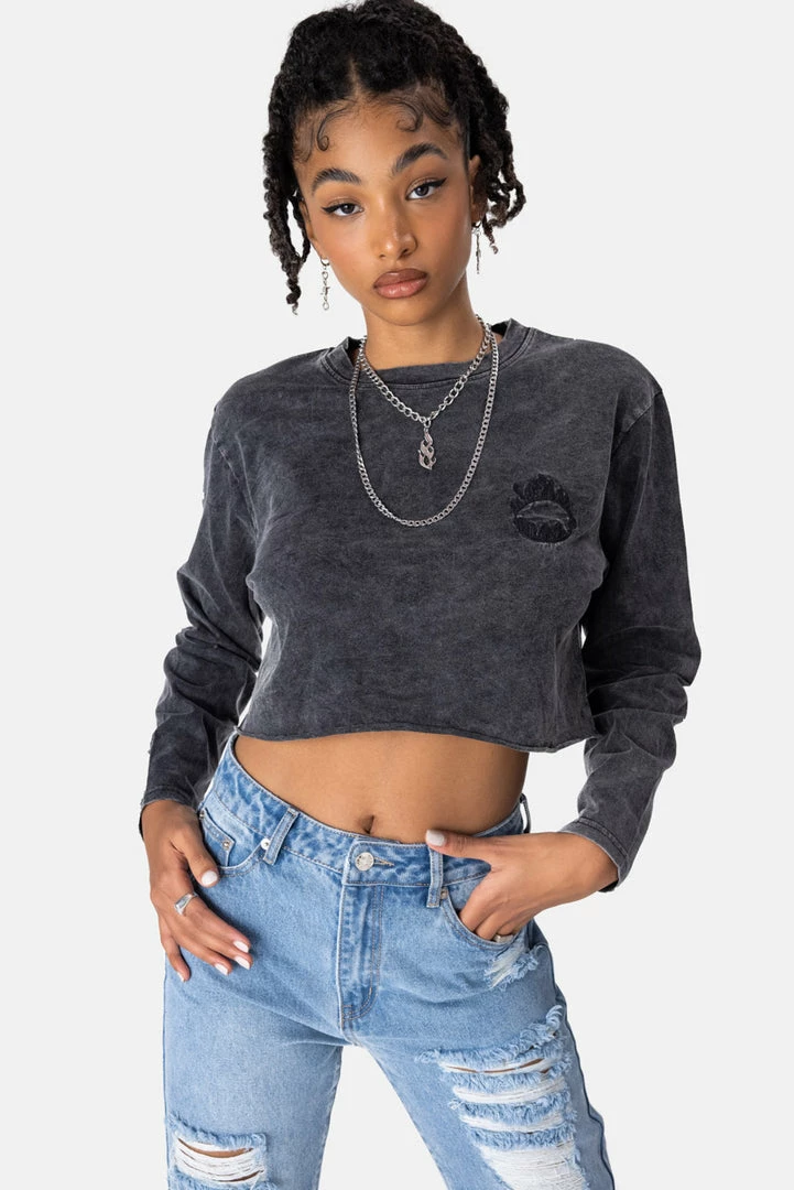- Stressed out but fine, just cuz, life. Washed long sleeve t-short with embroidery in both front and back, a raw cut hem and round neck.