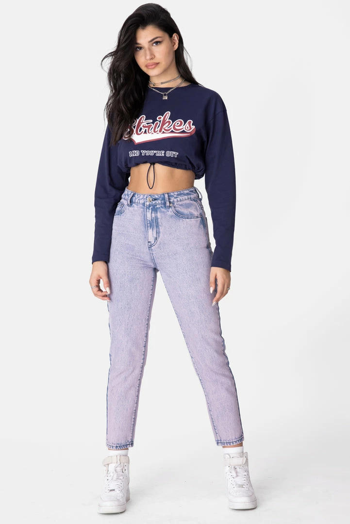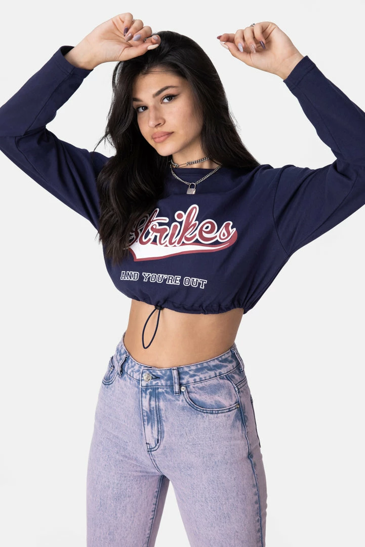 - All right, you win. Cropped t-shirt style top with graphic print on the front, elastic pull string at the hem, long sleeves and a crewneck.