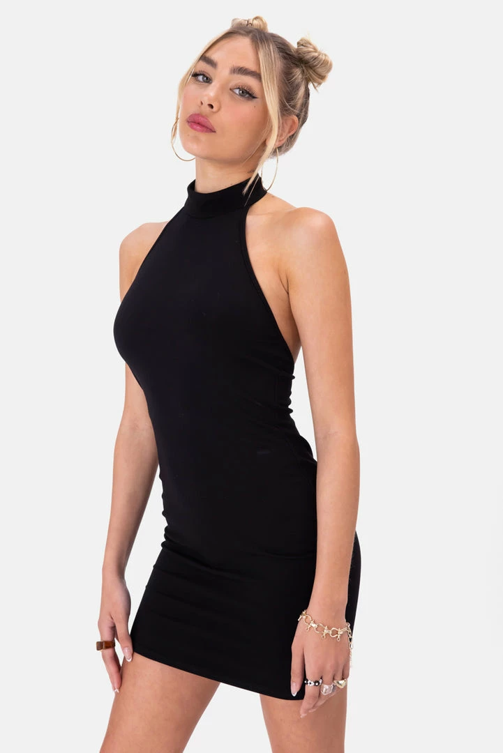 - Our life is an LBD moment. Halter mini dress in a stretchy fabric featuring a high collar with button closure and an open back.