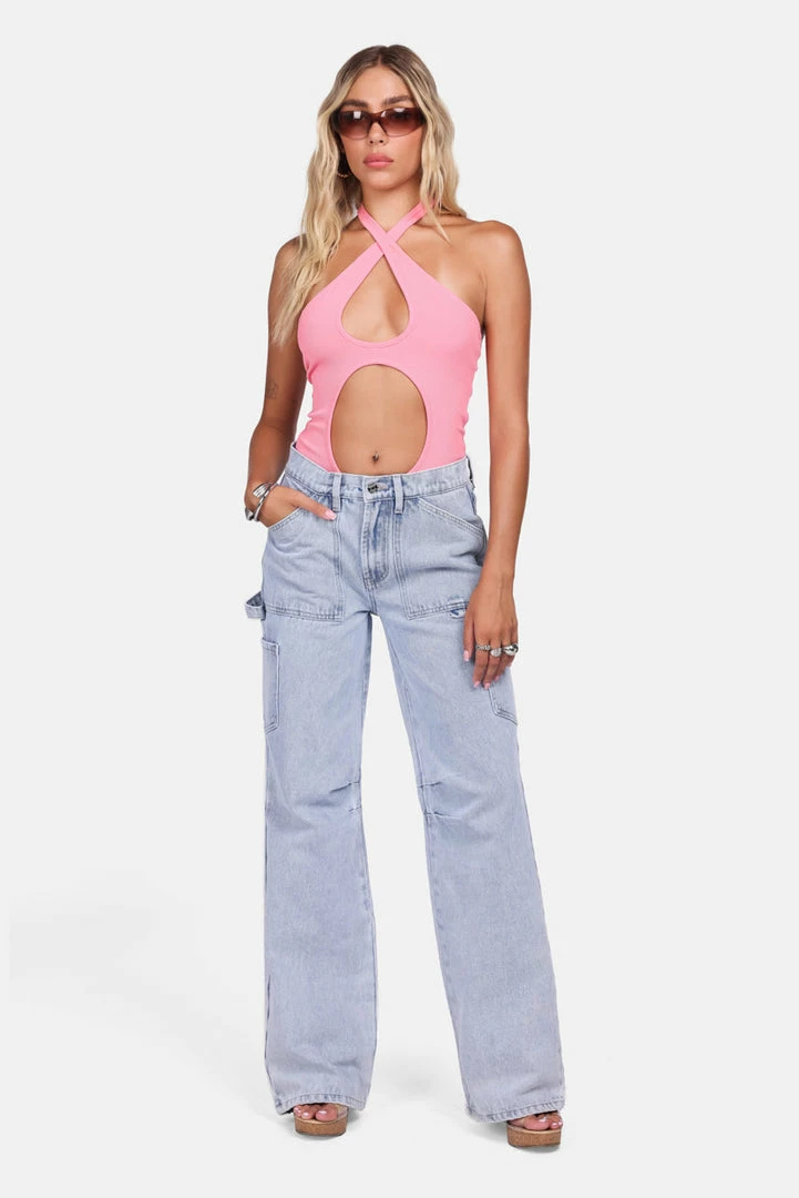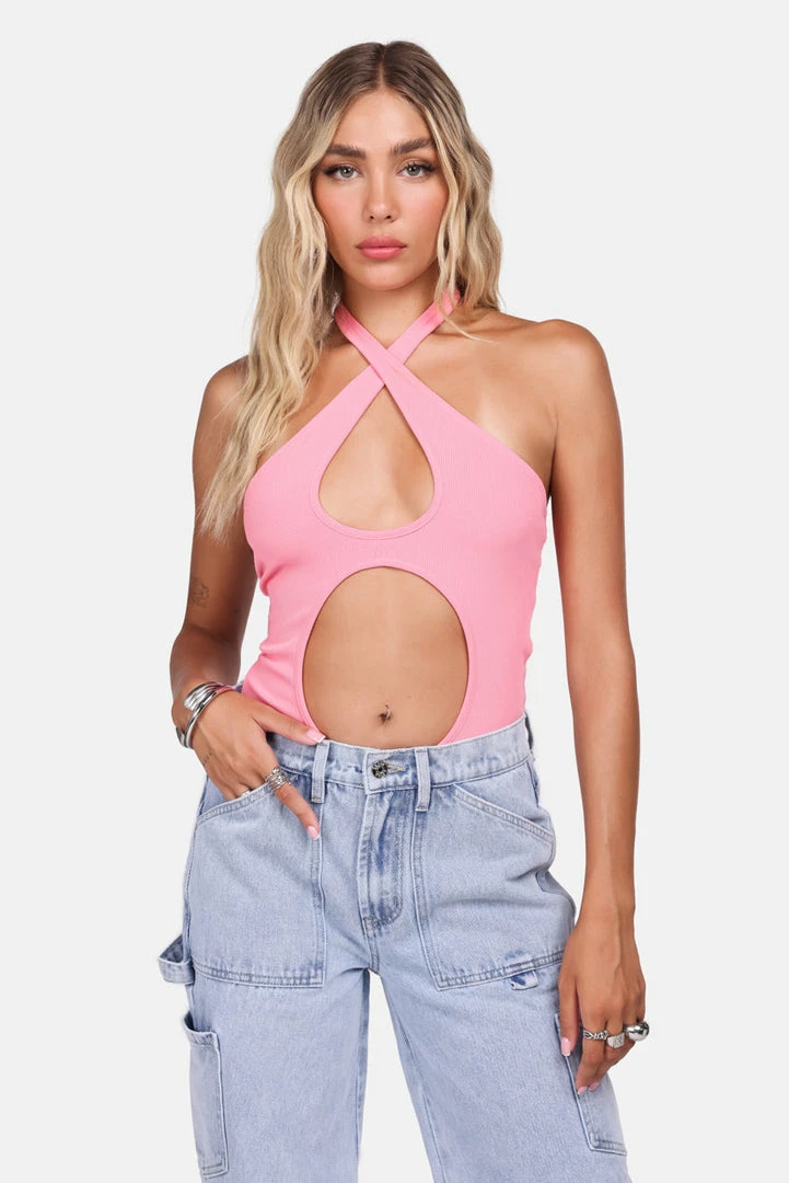 - Backdoor girl. Ribbed bodysuit featuring a cross-wrap halter neckline, lit cut-out detail and hidden snap button closure.
