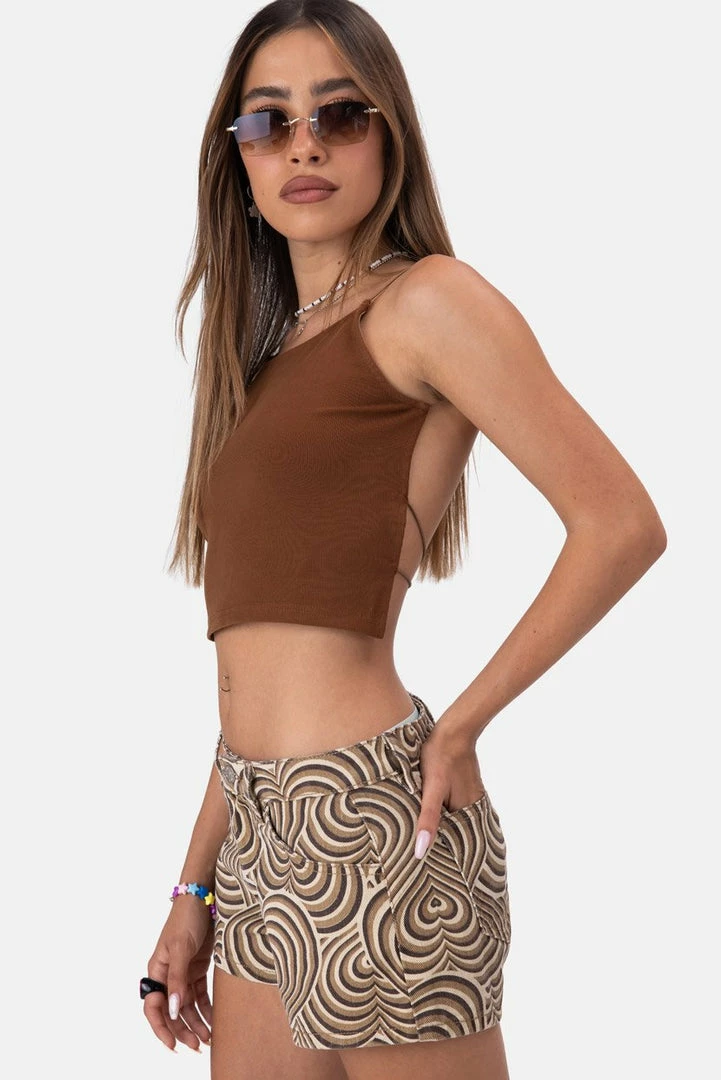 - Look back at it! Round neck crop top in a stretchy fabric featuring open back with criss cross detail and thin spaghetti straps