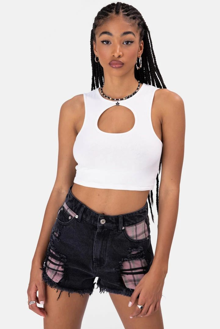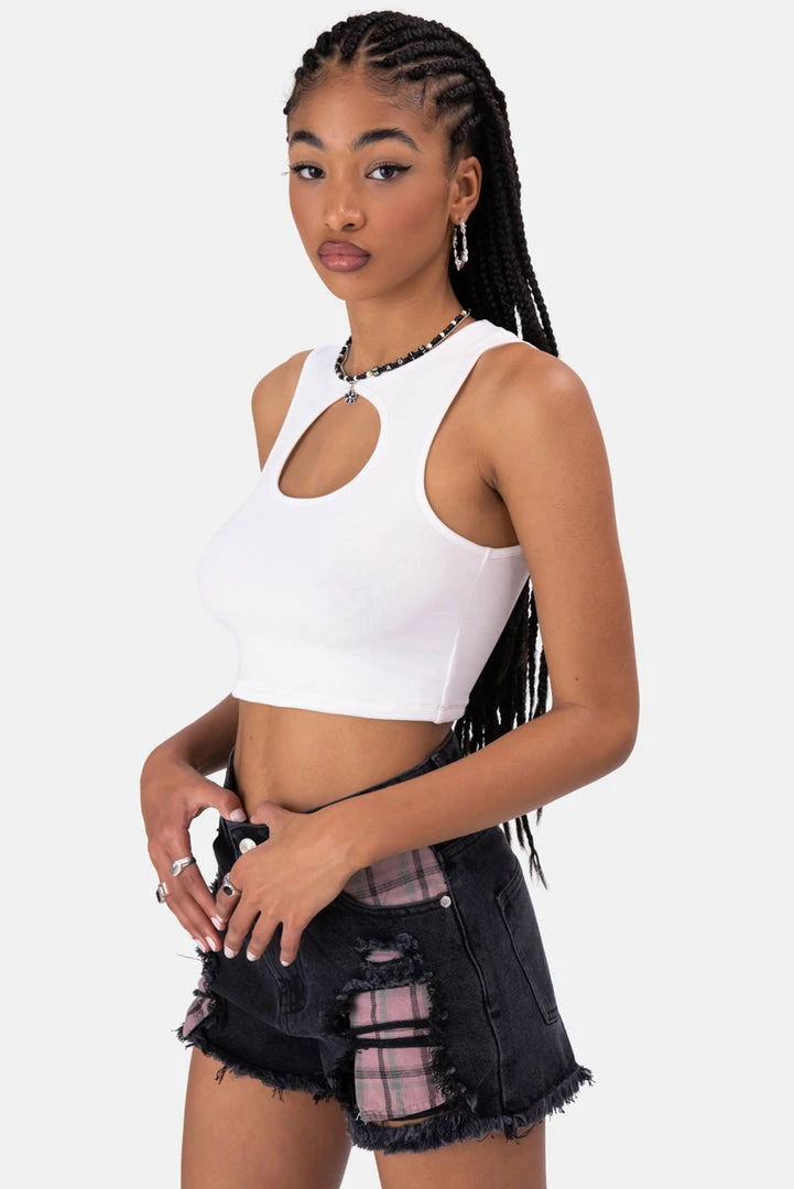 - Cut to the chase. Tank top style ribbed cropped top with cut-out detail in the front, round neck and low arm cut.