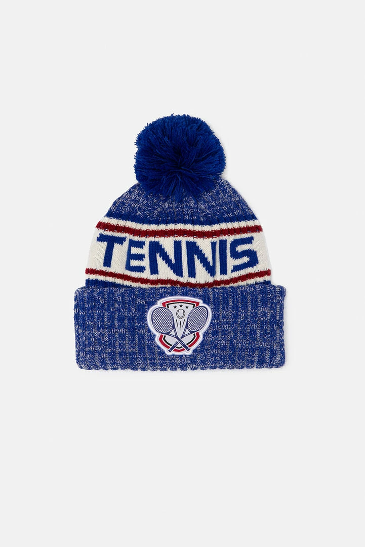 - Ready for a serve? Knit beanie with woven in graphic, embroidered patch in the front and a pom pom at the top.