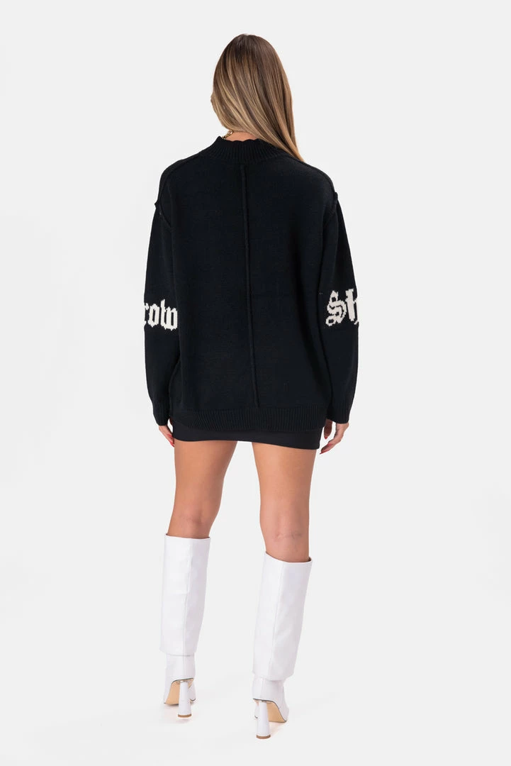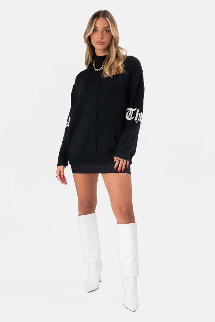 - Dis and tell. Oversized knit sweater with woven-in typographic detail, long sleeves, mock neck, tonal seam detail, dropped shoulder line and ribbed outline.