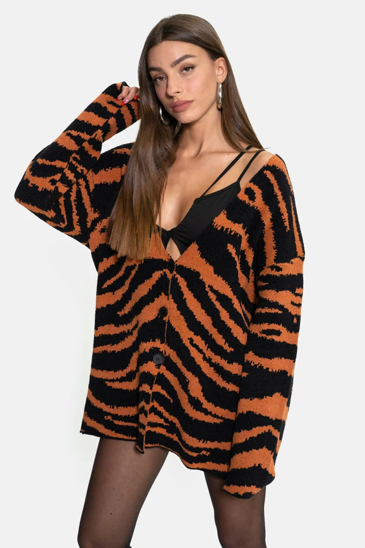 - The hunt is over. Oversized longline knit cardigan in all-over tiger pattern with button closure, V neckline and dropped shoulder line.
