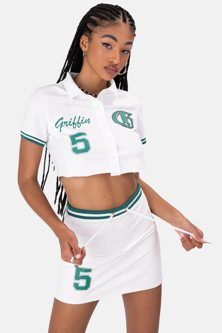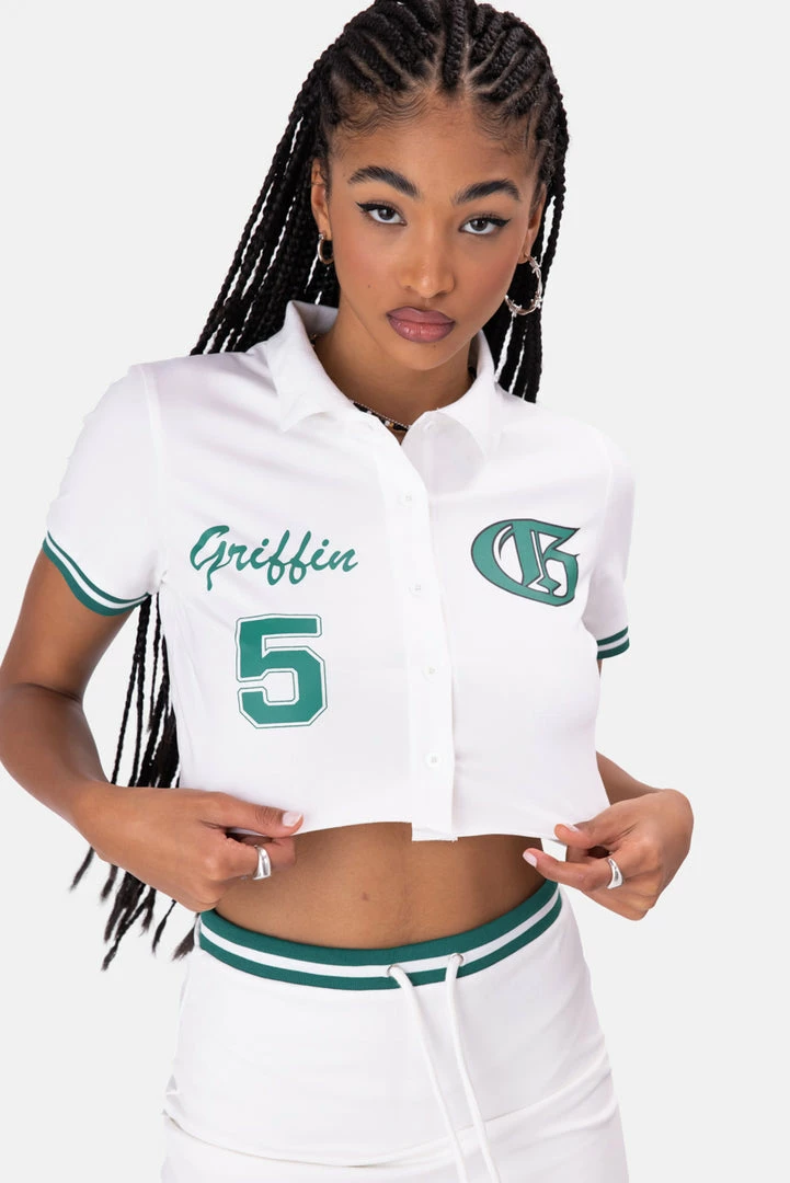 - Get in our league. Stretchy polo style cropped top with a classic collar, button-up closure, contrasting striped ribbed cuffs, graphic print on the front and raw-cut hem.