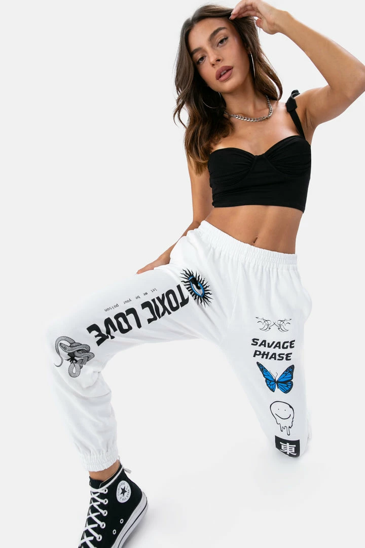 - Between us, the only thing toxic about these pants are you getting addicted to them. Jersey sweatpants with graphic print in the front, elastic waistband, fitted cuffs and side pockets in a natural waist rise.