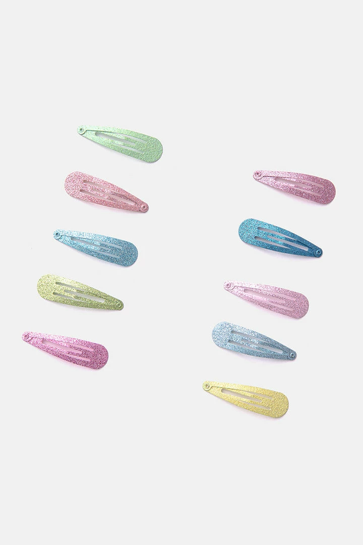 - Over the rainbow. Set of 10 hair snap clips in a metallic finish and mixed colors with all-over glitter.