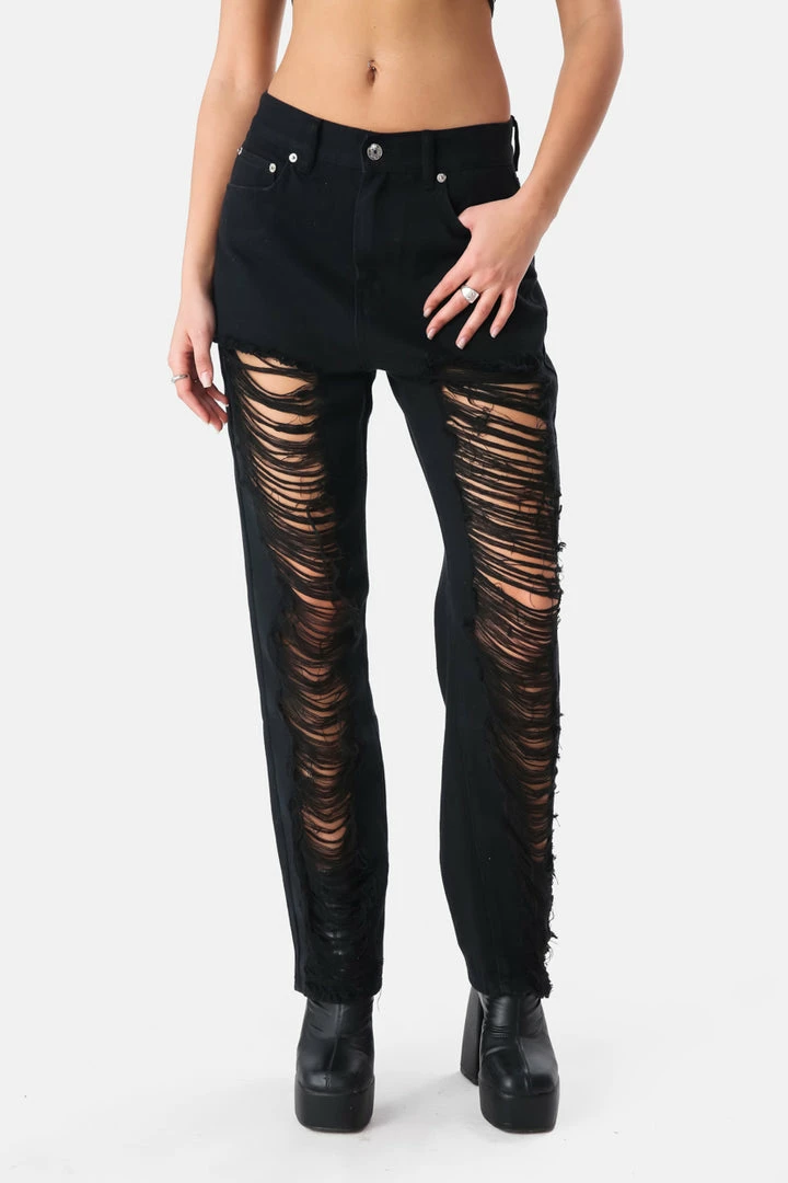 - Go to town, babe. Straight and relaxed fit jeans with mega distressed front, button and zip closure, belt loops and 5-pocket design.