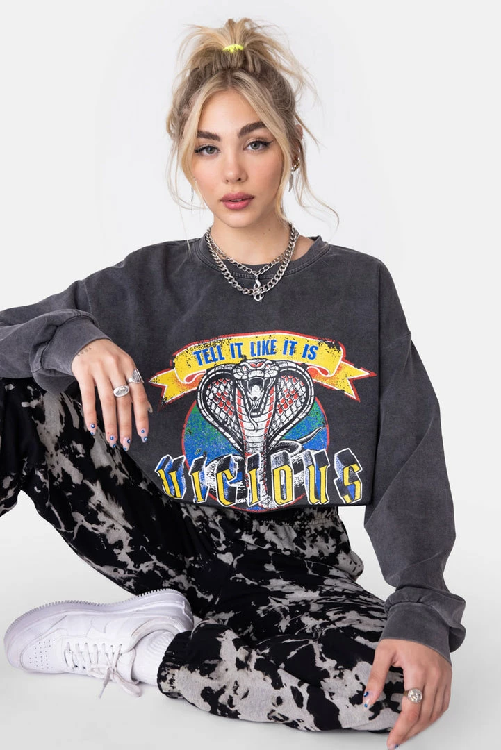 - Always tell it like it is, boo. Relaxed fit, washed, cropped t-shirt with long sleeves, vintage-style graphic print on the front, fitted cuffs, dropped shoulder line and raw-edge hem.