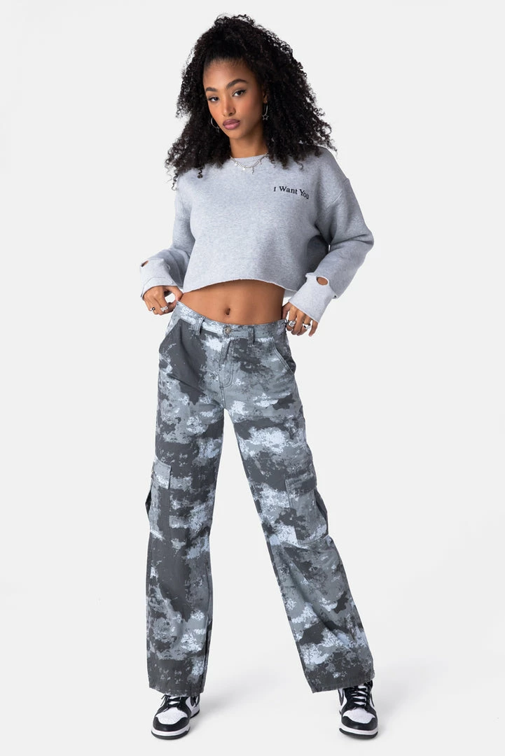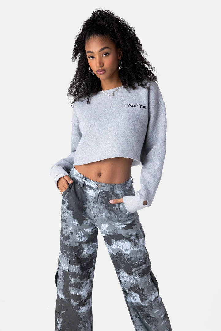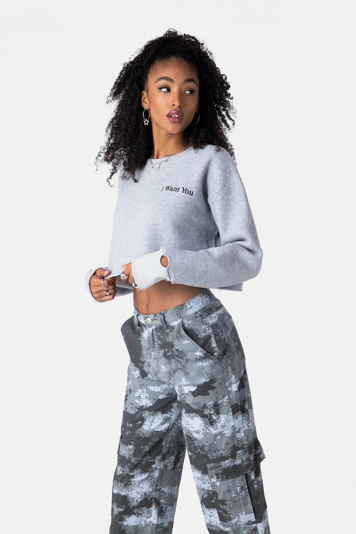 - You want, you got it. Warm sweatshirt in cropped fit with embroidery detail in both the front and the back. Including crew neckline, raw cut hem and long sleeves with ribbed, distressed cuffs.