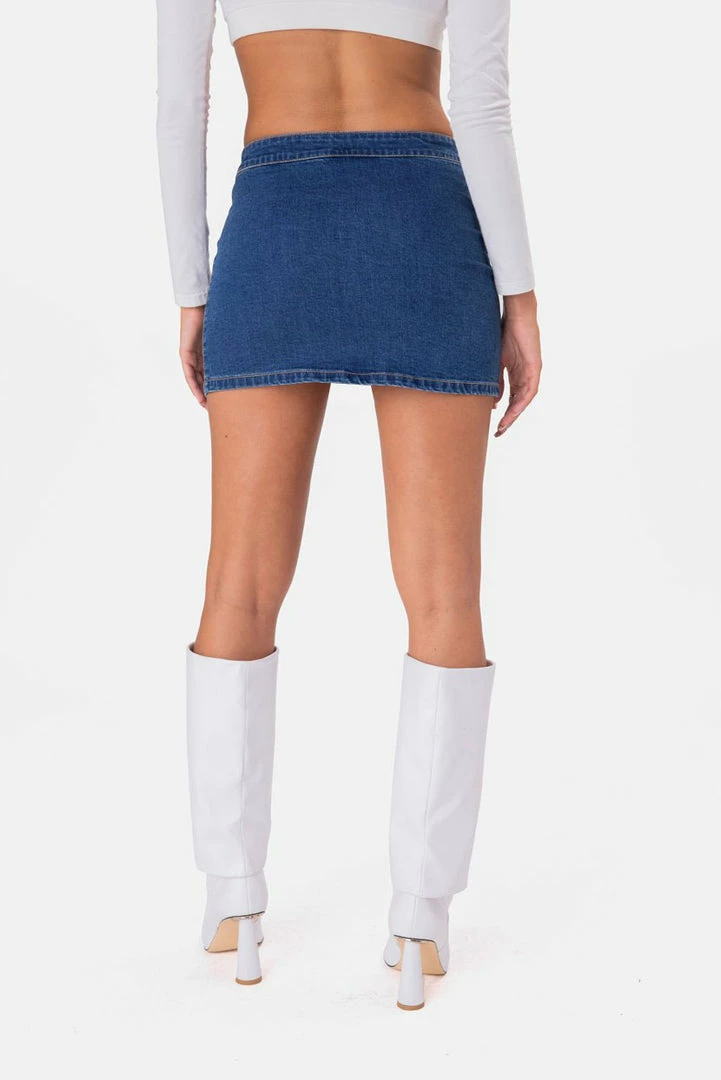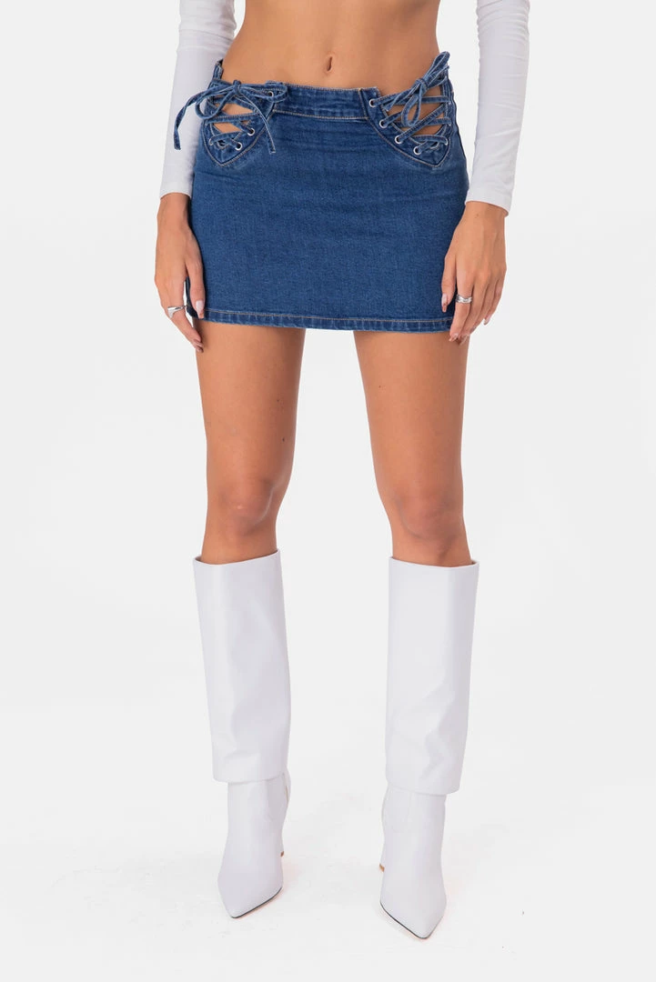- Real hot girl fit. Low rise, stretchy, denim skirt with super sassy, side lace-closure.