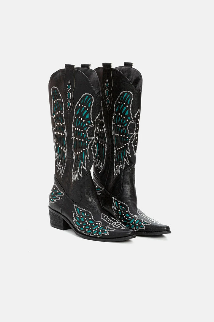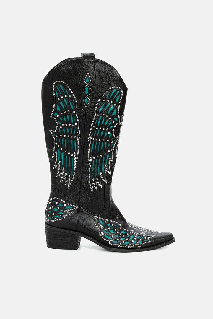 - Hashtag Cowboycore. Cowboy style, over-the-knee boots in mixed color faux leather. Featuring all-over perforated and embellished detailing, pointy toe, mid-high block heel and side pull tabs.