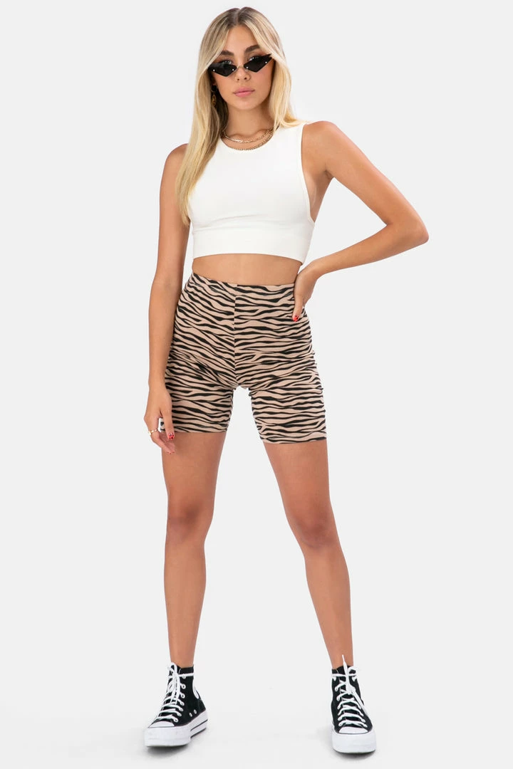 - Ever seen someone this stylish in the wild? Classic biker shorts in wildddd zebra print, with a banded waist for extra comfy wear.