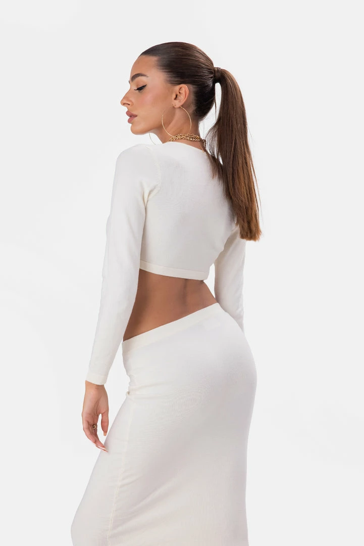 - Knit what you think. Cropped cardigan in super chic stretchy knit with button closure, round neckline and long sleeves.