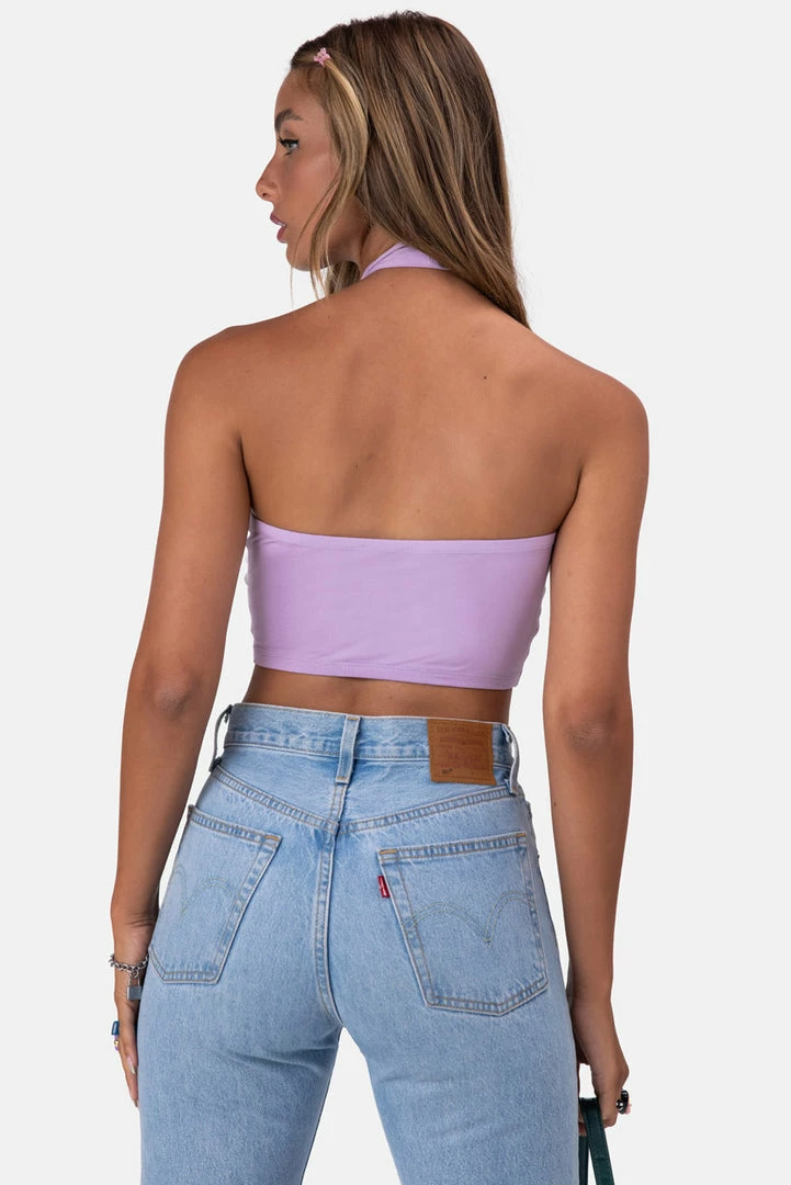 - Wrap your head around it. Pull-on, cross wrap halter top in a cropped fit with cut-out detail in the front and an open back.