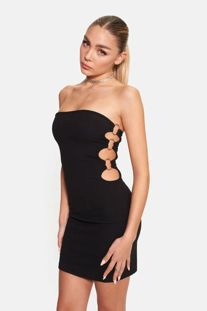 - Back in black. Tube style, stretchy mini dress with hidden back zip closure and super chic cut-out and metal ring detail in the sides.