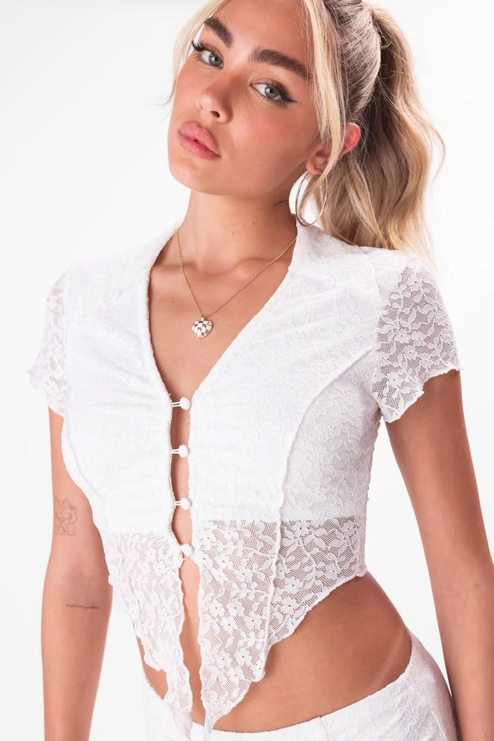- Cottagecore meets romance. Short sleeved top in dreamy lace with classic collar and V neckline. Inclduing button closure, inner lining at the bust and longer, front triangle hem.