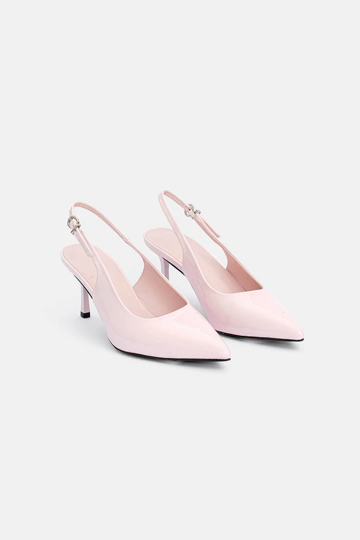 - Glossy bossy. PU sandals in retro design featuring closed pointy toe, slingback with pin buckle closure and low, stiletto style heel.