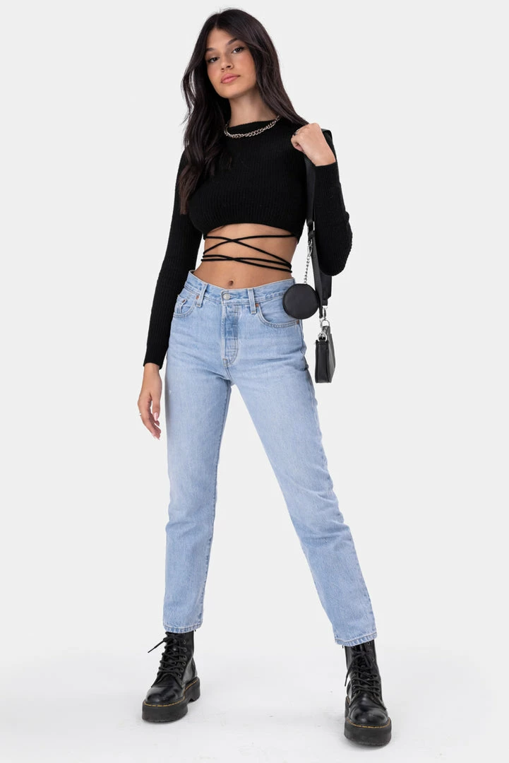 - Basic but playful. Cropped rib-knit top with long sleeves and long tie strings, that you can wear any way you choose. Mega fun.