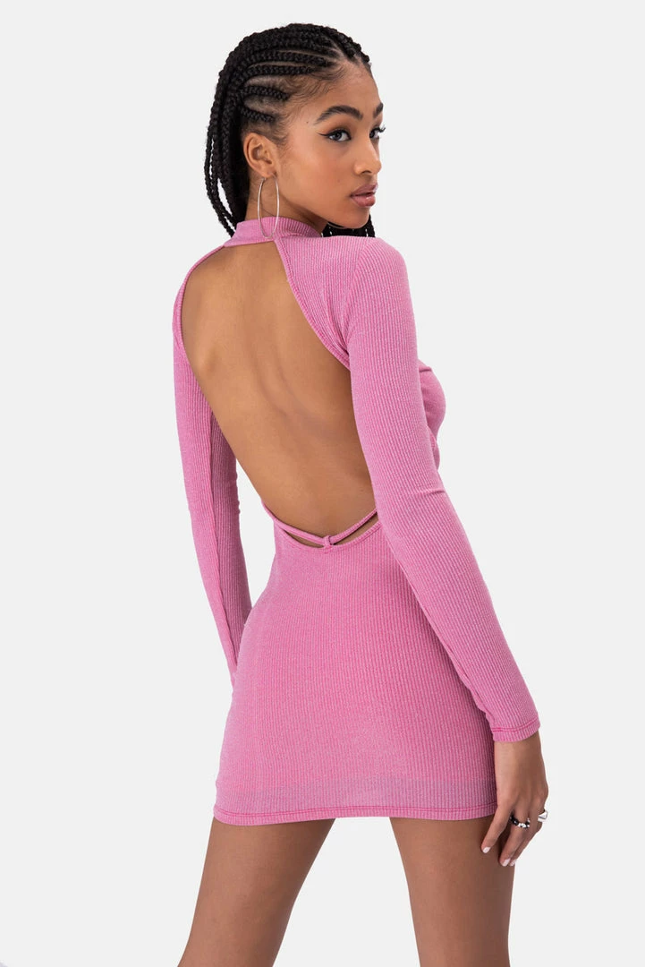 - Cuz that hottie is you. Fitted mini dress in a ribbed lightly sparkling fabric with a high neck, long sleeves, low back cut out with a string and loop detail in the bottom trim.
