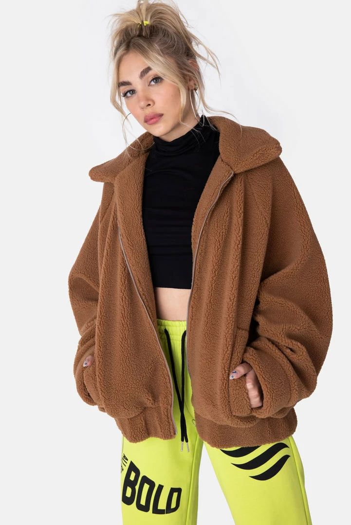 - BFF, the cozy-chic version. Oversized teddy jacket in faux shearling with spread collar, fitted hem and cuffs, zip closure and side welt pockets.