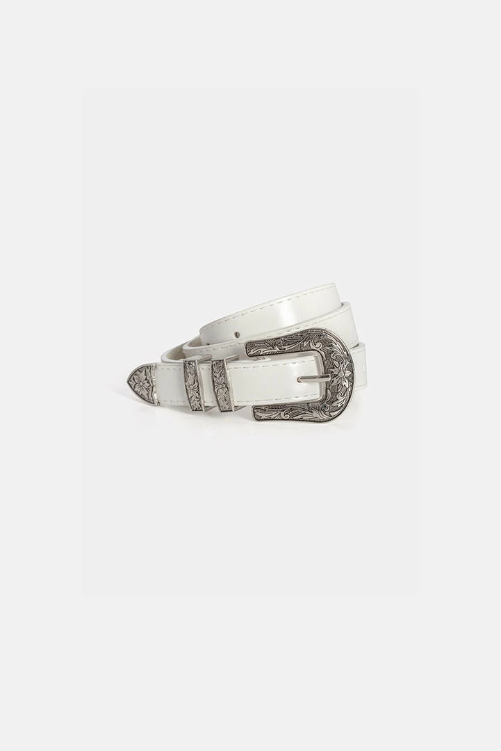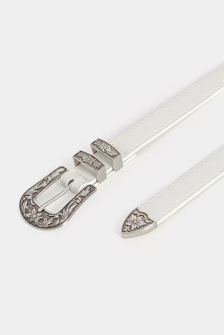 - Ties up your lewk. Adjustable faux leather belt with ornate metal buckle closure.